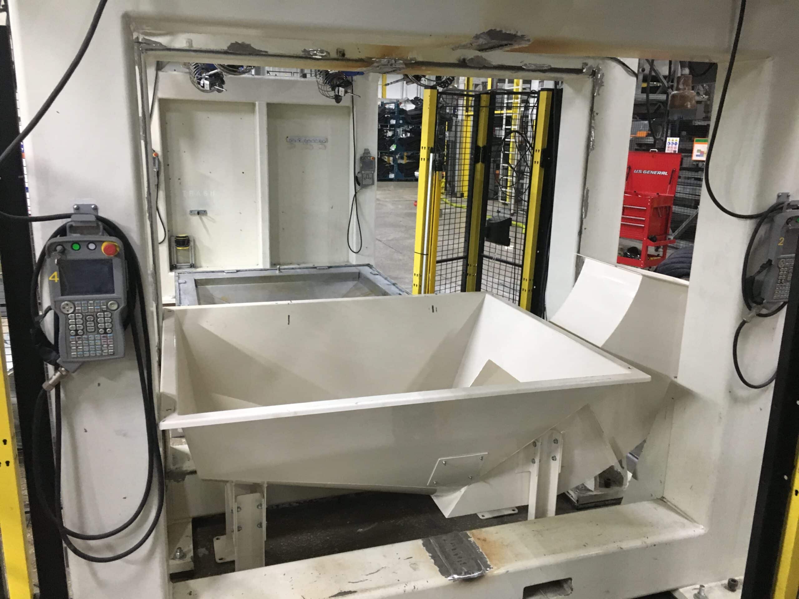 • Custom collection troughs positioned between water cutting cells allowed operators to easily feed large-format trim waste into the pneumatic system, while maintaining safe, ergonomic workflow.