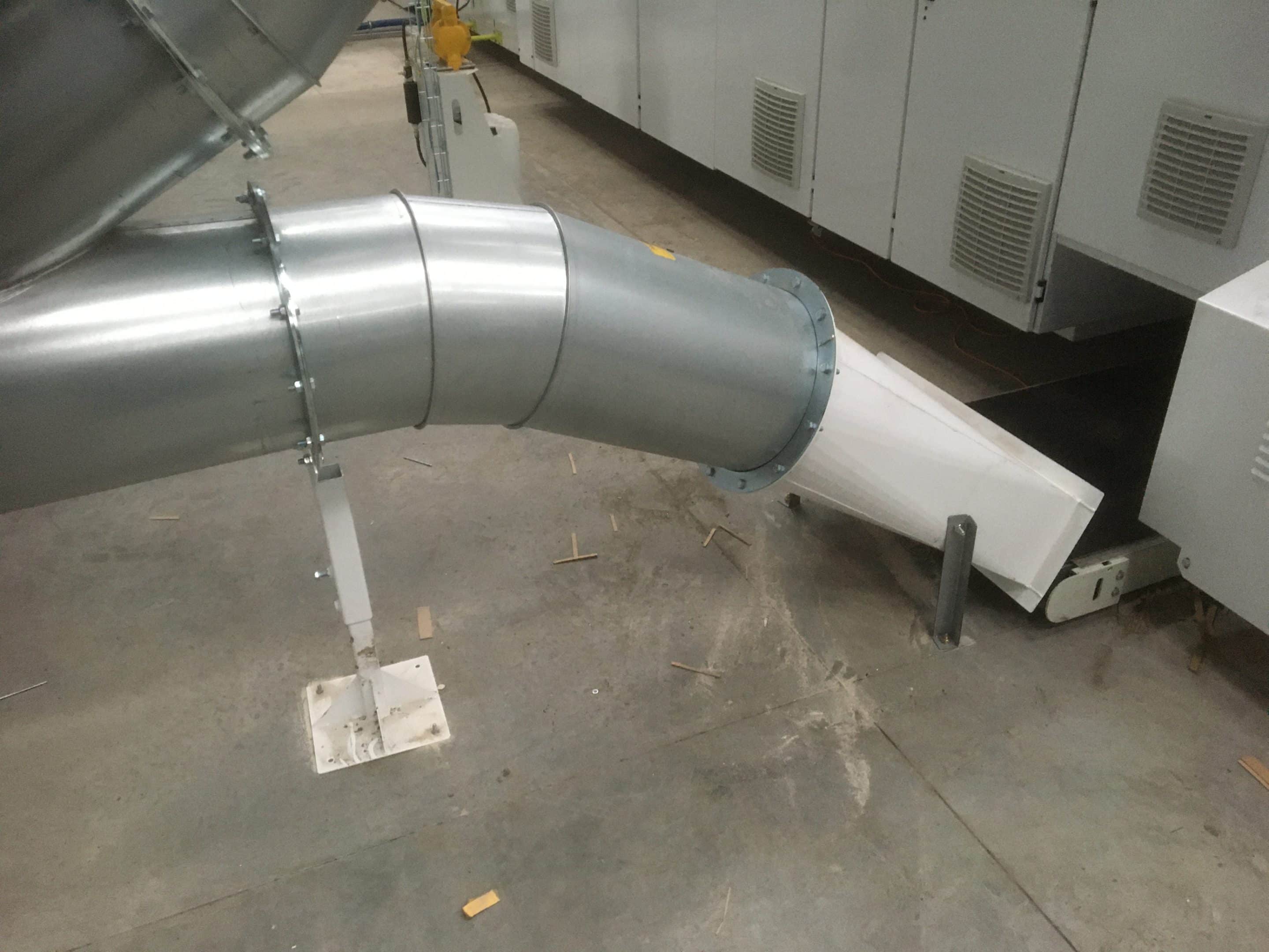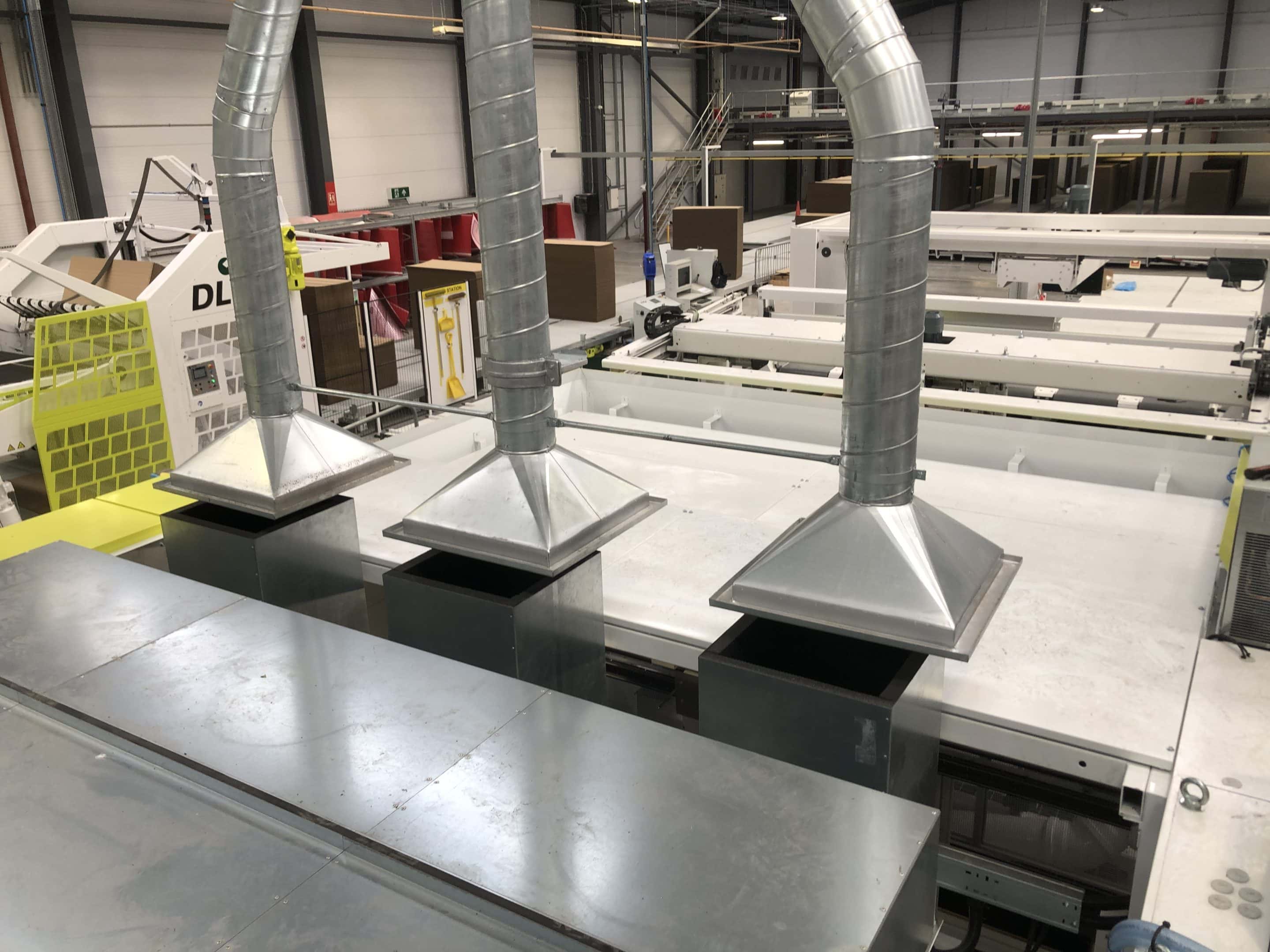 In order to seamlessly collect the continuous stream of corrugated board off-cuts, we installed a centralised trim extraction system consisting of collection hoods, conveyors, material conveying ductwork, rotary separator, chopper fan with acoustic enclosure, compactors and dust filter.