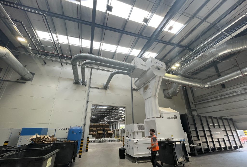 Our customer, a UK leading manufacturer of corrugated and pharmaceutical packaging, contacted us with the requirement for a corrugated board trim removal system and a dust control system for its new production facility in the north west of England.