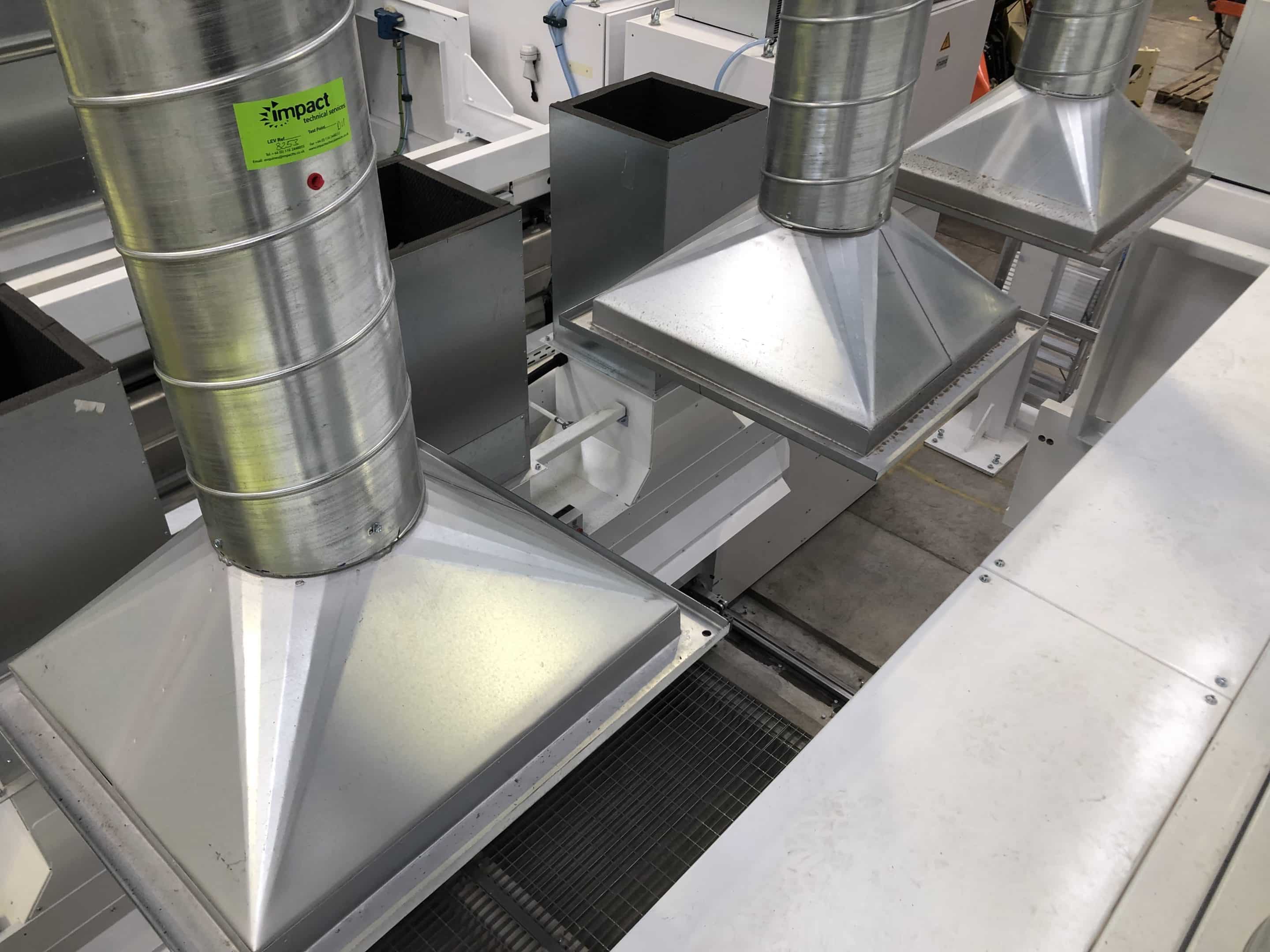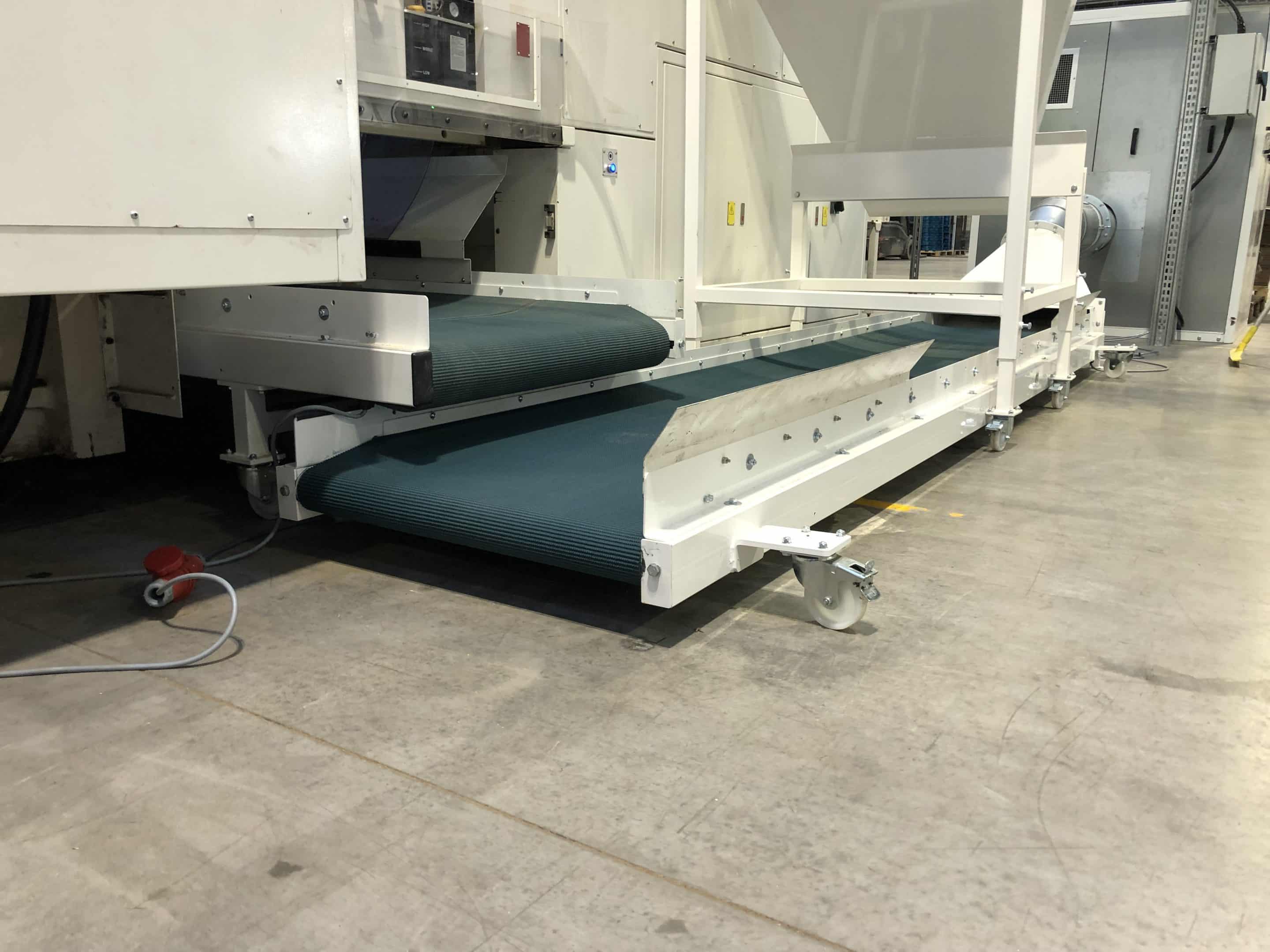 The board waste from the die station is discharged onto 600mm wide belt conveyors which transport the waste material from the underside of the Emba, Gopfert and Mitsubishi production machines, where it is collected from the belt conveyor using fishtail waste collection hoods.