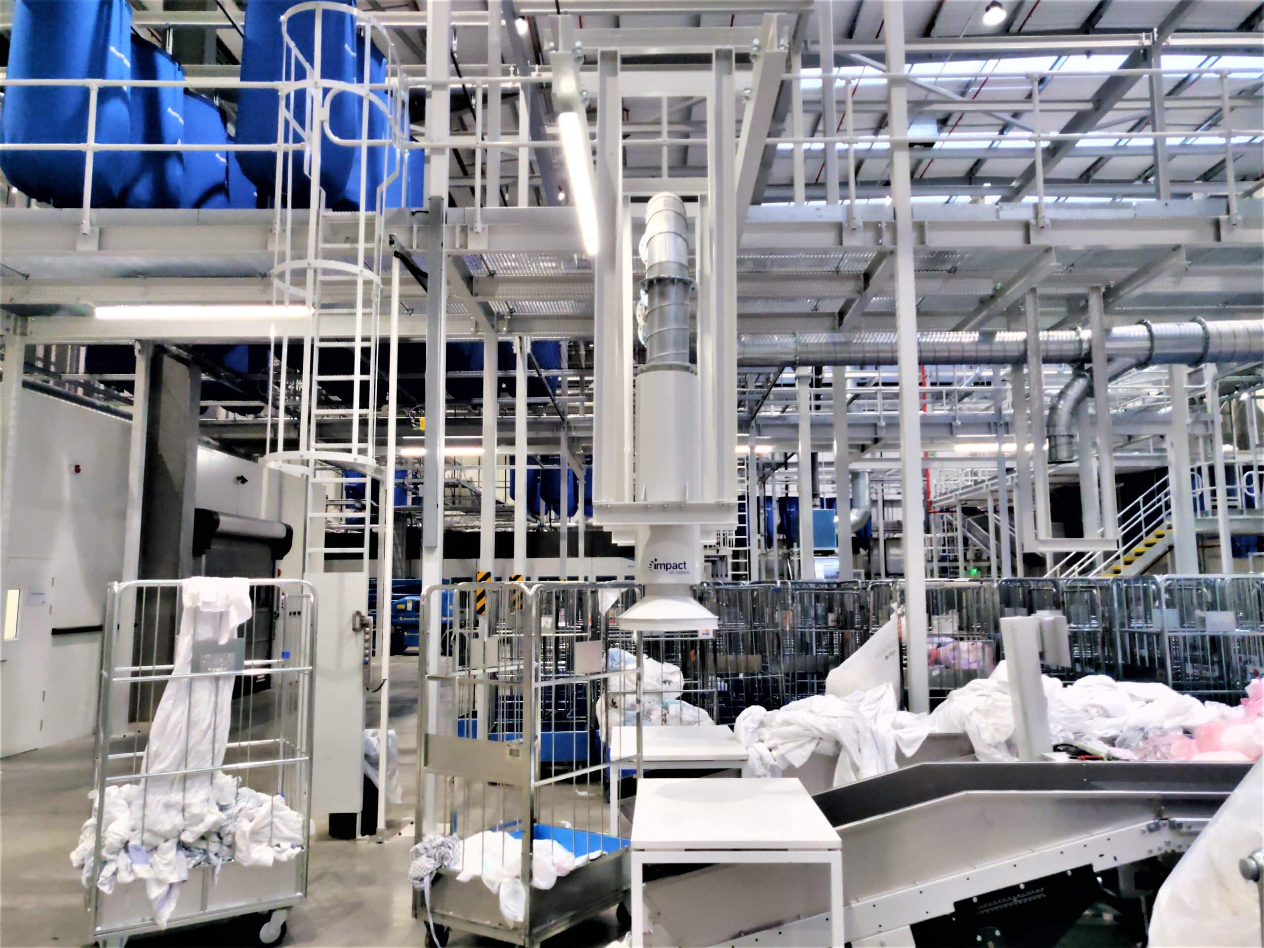 For this customer, Impact’s Film Vacuum solution consists of three collection hoods located at the primary unloading point and a further six collection hoods located in the garment sorting and quality control areas of the laundry room. The hoods are designed to allow operatives to feed emptied plastic bags into the capture hood as they unload the linen and garment contents.