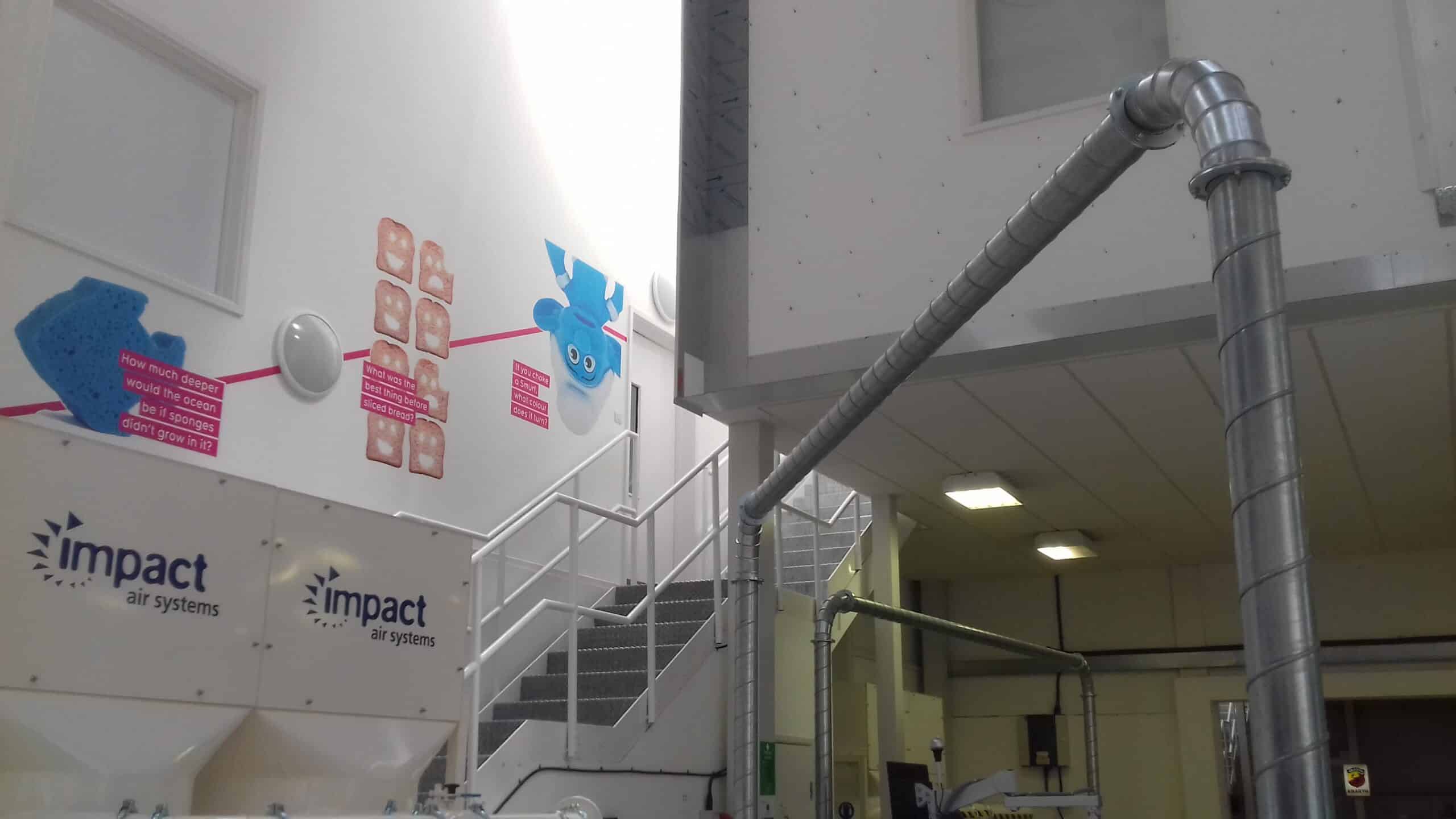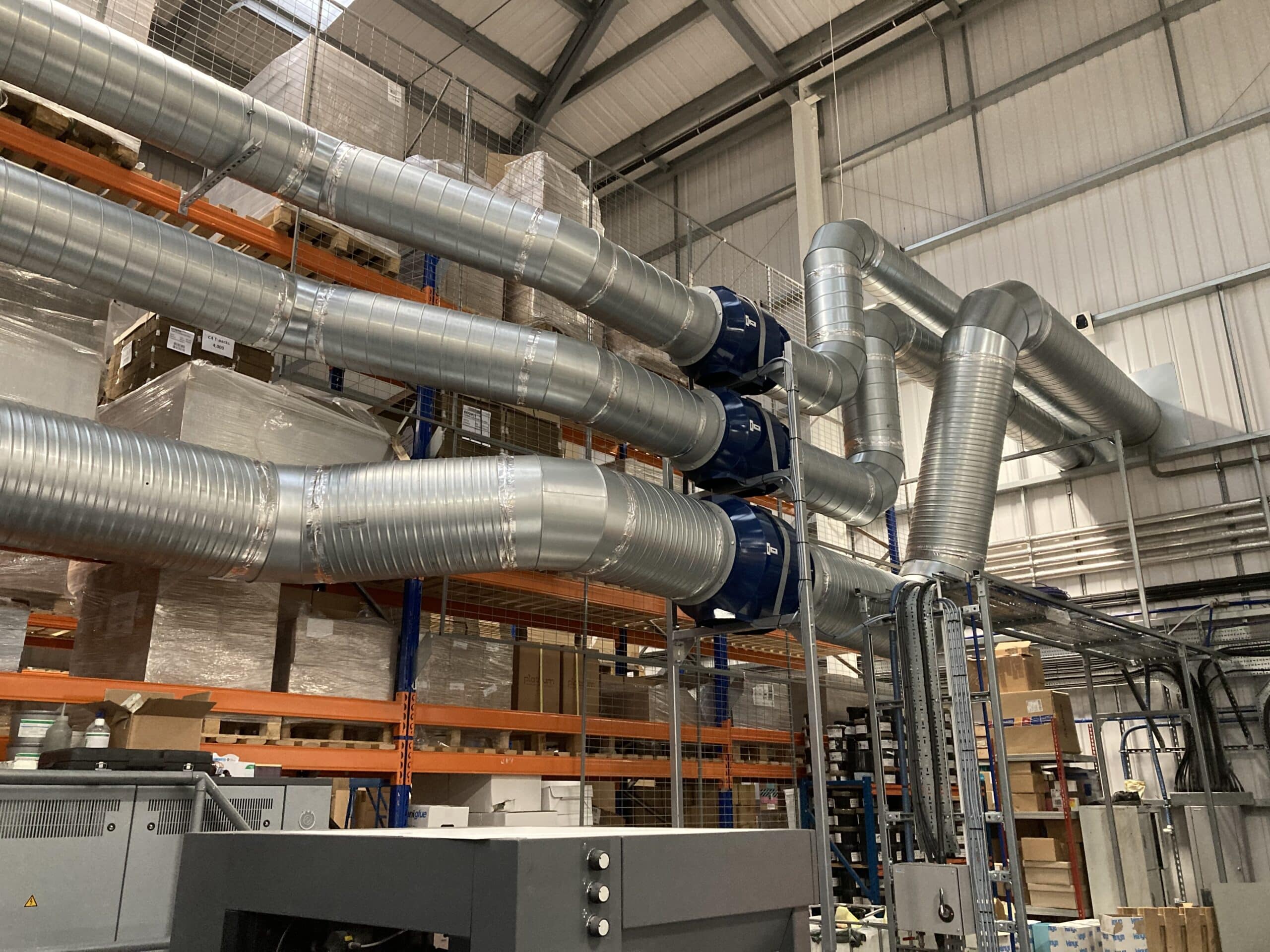 A range of waste conveying ductwork was installed via the machines extraction hoods which rises to high level. Each of the three extraction points (DryStar, AirStar and CombiStar)