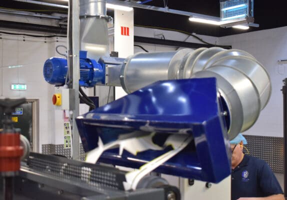 Our centralised matrix extraction systems are designed to seamlessly integrate with multiple narrow web presses (up to 500mm wide). Positioned on the non-operator side of the press, each unit features a precision trim cutter that chops the continuous matrix into small, manageable pieces. These are then transported via air ducting to a centralised collection point—eliminating the need for matrix rewinding and enabling longer, uninterrupted production runs.